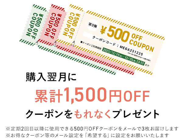 ほかにも、三ツ星ファームでは初回購入の翌月に累計1,500円分のクーポン(500円OFFクーポン×3枚)がもらえます。